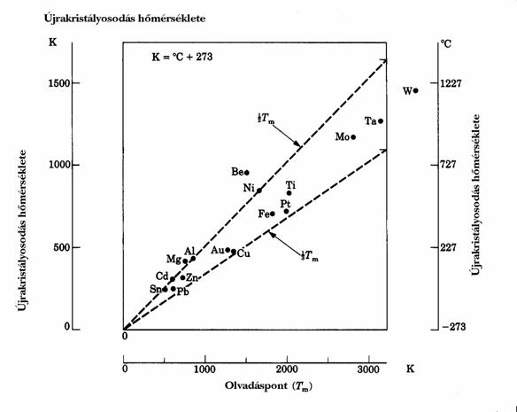 képlettel írható fel, amelyet a fenti ábra alapján értelmezhetünk. A diagram vízszintes tengelyén a fém olvadáspontja, baloldali függőleges tengelyén az újrakristályosodási hőmérsklete szerepel Kelvin fokban. Az ábrában szereplő fémek a 0,5 és 0,33 iránytangensű (Trekr=0,33.0,5 Tolv) egyenesek között helyezkednek el, tehát a 0,4-es iránytangens közelítőleg az előbbi értékek átlagaként fogadható el.