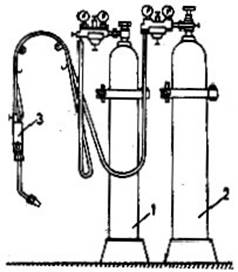 Az acetilén-oxigén lánghegesztő berendezés aránylag egyszerű és jól használható terepen, ahol nincs elektromos hálózat (15. ábra). A berendezés egy acetilénpalackból (1), egy oxigénpalackból (2) és egy hegesztőpisztolyból tevődik össze. A palackokra nyomás csökkentő reduktor van szerelve, amely speciális gumitömlőkkel van a hegesztő pisztolyhoz csatlakoztatva, egy-egy biztonsági szelepen keresztül, amely a lángvisszacsapás ellen védi a gázpalackokat. A hegesztőpisztoly (3) biztosítja a két gáz megfelelő keverését, a gázmennyiség beállítását két szelep segítségével és a láng égését a réz égőfej előtt. Az égőfej |