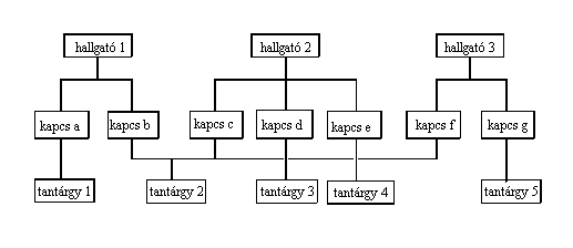 Vezessünk be kapcsolatrekordokat, amelyek a hallgató kódját és a tantárgy kódját tartalmazzák. Ekkor egy hallgatórekordhoz azok a kapcsolatrekordok tartoznak, amelyek az adott hallgató által felvett tantárgyak kódját tartalmazzák, az egyes tantárgyrekordokhoz pedig azok a kapcsolatrekordok, melyek azoknak a hallgatóknak a kódját tartalmazzák, akik a tárgyat hallgatják. Így mind a hallgató és a kapcsolat, mind a tantárgy és a kapcsolat rekordok között 1:N típusú kapcsolat áll fenn.