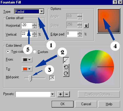 A színátmenet középpontjának áthelyezése történhet a mintaábrán (4), vagy
