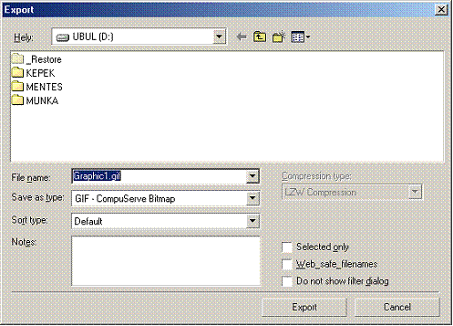 Fontos, hogy az exportálás első lépéseként a file formátumát válasszuk ki. Adjunk nevet a képnek és ügyeljünk arra, hogy a Selected only jelölőnégyzet be van-e kapcsolva. Bekapcsolt állapotában csak a kijelölt elemek exportálódnak, egyébként az összes objektum a rajzterületen.