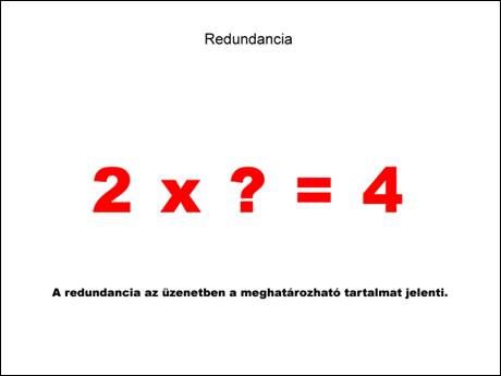 A redundancia az üzenetben az előre meghatározható tartalmat jelenti. Ez az információ már ismert a befogadó számára, ismeri a jelentését, tehát konvenciókon alapul. Ha a tévénéző meglátja a reklámban a kék kertésznadrágba öltözött, enyhén pocakos szakit, kezében a mosógép fűtőszálával, akkor biztos lehet abban, hogy a vízlágyítószer hirdetését nézi, bár még el sem hangzott annak neve. Ez az üzenet erősen redundáns, vagyis gyakran ismétlődő és kevéssé tartalmaz új információkat (legfeljebb a mosógépszerelő figurája változik néha). A redundancia a kommunikációnak elengedhetetlen feltétele, nélküle értelmezhetetlen és vadonatúj információkkal lennénk körülvéve. Tehát a kommunikáció gyakorlati nehézségeinek lebirkózását szolgálja, vagyis annak tökéletesítésének eszköze.