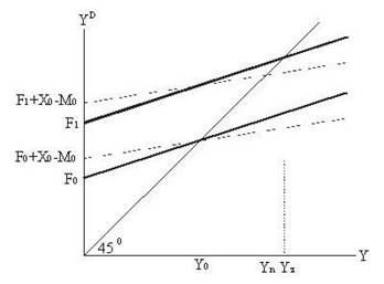 Felül látható az export- és importfüggvény. Az importfüggvény meredeksége az import-határhajlandóság, ha tehát az import-határhajlandóság nő, az importfüggvény meredekebb, ha csökken, laposabb lesz. Az alul látható külkereskedelmi függvény Ye jövedelemszinten van egyensúlyban. Ennek fenntartása a tudatos gazdaságpolitika feladata, mert nincs olyan automatikusan működő gazdasági mechanizmus, amely biztosítaná azt. Változatlan autonóm részek és import-határhajlandóság esetén, amíg a jövedelem el nem éri Ye-t, a külkereskedelmi mérleg szufficites lesz, és Ye jövedelemnél kerül egyensúlyba. E felett deficit keletkezik, ami folyamatosan nő.