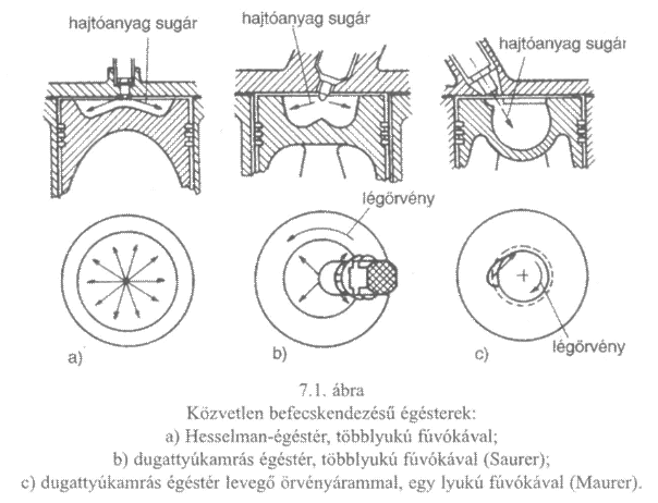 A közvetlen befecskendezés sokféle kialakítása ismert, elterjedten alkalmazzák. Jelentősége a dízelmotor fordulatszám növelésével és a környezetvédelmi előírások betartásával arányosan egyre nagyobb. Nagyobb hengerméretek esetén, ahol a keverékképzéssel kapcsolatos igények nem túlzottan szigorúak, gyakran alkalmazzák a 1.a. ábrán bemutatott Hesselmann égésteret.A befecskendezett hajtóanyag-sugár energiája elegendő ahhoz, hogy az égéstérben megfelelő cseppeloszlás és keveredés jöjjön létre. További légörvénykeltést a rendszer nem igényel. A hajtóanyag befecskendezésére centrális elhelyezésű, többfuratú fúvókát alkalmaznak.