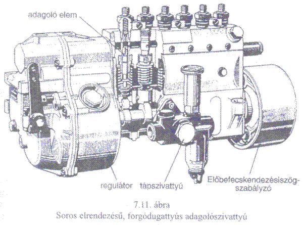 Napjainkban sokféle befecskendező szivattyút és fúvókát alkalmaznak. Az egyik legelterjedtebb kivitelű a soros elrendezésű forgódugattyús befecskendező szivattyú (11. ábra). A forgódugattyús befecskendező szivattyúban bütykös tengely működteti az egyes adagoló elemeket (hengerenként egyet), melynek dugattyúi igen pontosan illeszkednek házukban. Külön tömítést az elem és a hüvely között nem alkalmaznak. A felfelé haladó adagoló elem először elzárja a közös tüzelőszer csatorna nyílását, majd a tovább felfelé haladó elem, maga előtt tolva a hajtóanyag oszlopot, a hajtóanyagot egy visszacsapó szelepen keresztül a nagynyomású vezetékbe továbbítja (12. ábra). Az egyes elemeket rugók szorítják az ülékükre ezáltal kényszerítve arra, hogy a bütyökprofilt kövessék. Az elemek lökete állandó. A befecskendezés röviddel azután kezdődik, hogy a nagynyomású vezetékben a nyomás elkezd növekedni. A befecskendezés kezdetét a szivattyú tengelyének a motor főtengelyéhez viszonyított helyzete határozza meg.
