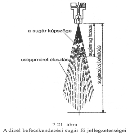 A 21. ábra egy tipikus hajtóanyag sugarat mutat, közvetlen befecskendezésű motor esetén. Ahogy a folyadéksugár elhagyja a fúvókát és ütközik az égéstér levegőjével, az áramlás turbulenssé válik. A sugár szétnyílik. Kezdeti sebessége általában nagyobb, mint 100 m/s. A fúvóka nyílása közelében a sugár külső felületén a tüzelőanyag 10-12 m m átmérőjű apró cseppekre szakad. A továbbiakban a beáramló folyadék különböző méretű cseppek formájában terjed szét az égéstérben. Ahogy az egyes cseppek távolodnak a fúvókától, a levegő aránya a folyadék fáklyán belül egyre növekszik, a sugár egyre jobban szétnyílik és csökken a cseppek sebessége. A hajtóanyagcseppek égéstérbe történő behatolása során jelentős mértékben megnő párolgásuk. A sugár csúcsa hatol a legtávolabb az égéstérben, de sebessége fokozatosan csökken. Minden folyadéksugár cseppekre és sugár fonalakká bomlik. A sugár behatol a levegőbe, szétterjed és lelassul. Először a sugár külső szélén lévő cseppek kezdenek el párologni, elkeverednek a levegővel és gőzfelhőt képeznek, mintegy védőburkolatként körülvéve a sugármagot. A legnagyobb áramlási sebesség a sugár magjában található. A hajtóanyag-levegő keverési aránya a sugár keresztmetszetében változik, a legkisebb a légviszony középtengelyénél, míg attól távolodva, a sugár határfelületénél (keveretlen levegő), fokozatosan nő. Ha a sugár eljutott az égéstér széléig, akkor kapcsolatba kerül a henger falával. Itt a sugár irányt változtat és követi a fal görbületét.