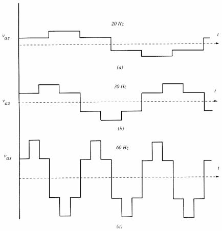 Azaz, a motort állandó feszültség/frekvencia viszonynak megfelelöen kell táplálni, leszámítva az állórész ellenállás miatti korrekciót. A változtatható egyenfeszültség miatt vezérelhetö egyenirányító kapcsolás szükséges. Az inverter a teljes frekvencia tartományban 6 lépcsös üzemmódban müködik, amint az 1.6 ábrán látható.
