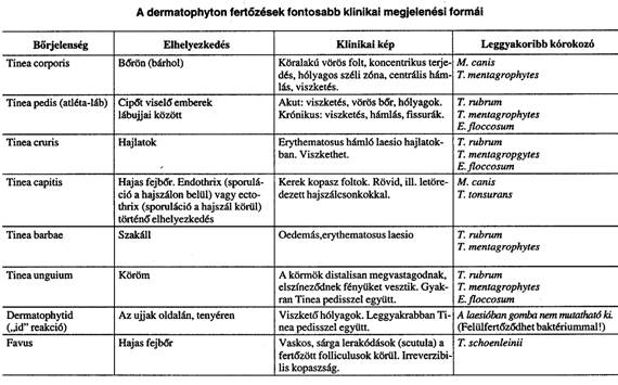 A dermatophytosisok krónikus fertözések. A börön hámlást, hiperkeratózist okoznak, ritkábban kör alakú, radiálisn terjedö gyulladásos zóna jelenik meg, olykor súlyosabb, ödémás erythematosus laesiók kísérik.