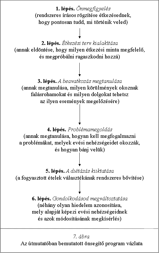 Bizonytalan lehetsz abban, hogyan ítéld meg az elért haladás jelentőségét. Bár bizonyára elérted azt a pontot, ahol meg tudod tartani az étkezési tervedet, ahol már nincsenek falási rohamaid, nincs túlevési késztetésed, és nincs olyan étel, amit ne tudnál mértékkel bevenni az étkezési tervedbe. Míg ez csodálatos haladás lenne, van még két további téma, amivel foglalkozni kell. Az egyik a súllyal és alakkal kapcsolatos elképzeléseidre és hiedelmeidre vonatkozik (l. alább a 6. lépést). A másik arra a képességedre, hogy bánni tudj minden helyzettel, melyben az étel korábban nehézséget jelentett számodra. Például sok ember nagy problémának találja, hogy olyan ételt egyen, melyet más készített el és szolgált fel, mert nincs ellenőrzésük az összetétel, mennyiség és kalóriatartalom fölött. Néhányan az evést bizonyos szociális helyzetekben nehéznek találják, mint amilyen az esti vendégség, ahol úgy érzik, hogy étkezésük közszemlére van kitéve. Nagyon gyakori az emberek számára, hogy eléggé képtelenek olyan helyzetek kezelésére, ahol kis mennyiségű ételek tűnnek fel, mint például koktélpartin, ahol látszólag korlátlan mennyiségű ételt tesznek ki (büfé, svédasztal).