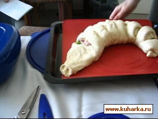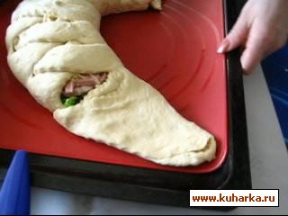 Az alapanyagokat összedolgozzuk, hagyjuk megkelni, majd megtöltjük, megkenjük tojással és megsütjük