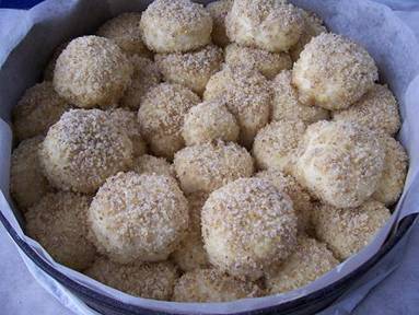 Ha a tésztánk megkelt, nyújtsuk ki kb. egy - másfél centi vastagságúra és egy kisebb pogácsa szaggatóval szaggassuk ki a tésztát. A kiszaggatott tésztákat mártsuk bele egy villával az olvasztott margarinba és forgassuk meg jól a cukros dióba. Ezután tegyük szorosan a tésztadarabokat a tortaformába és szórjuk a tetejére a maradék cukros diót. Így kelesszük még újabb 30 percig.