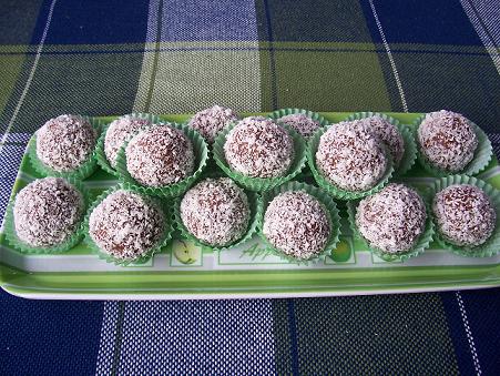 Elkészítése: A kekszet ledaráljuk, elkeverjük a cukorral, a kakaóval és a szobahőmérsékletű vajjal. A meggybefőtt rumaromával ízesített levéből annyit teszünk hozzá, hogy formálható legyen. Nedves kézzel golyókat készítünk belőle és egyenként megforgatjuk őket a kókuszreszelékben. Fóliával letakarva hűtőszekrénybe tesszük, míg megkeményedik. Egy kevés kávéval még ízesíthető.